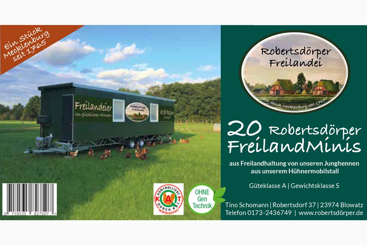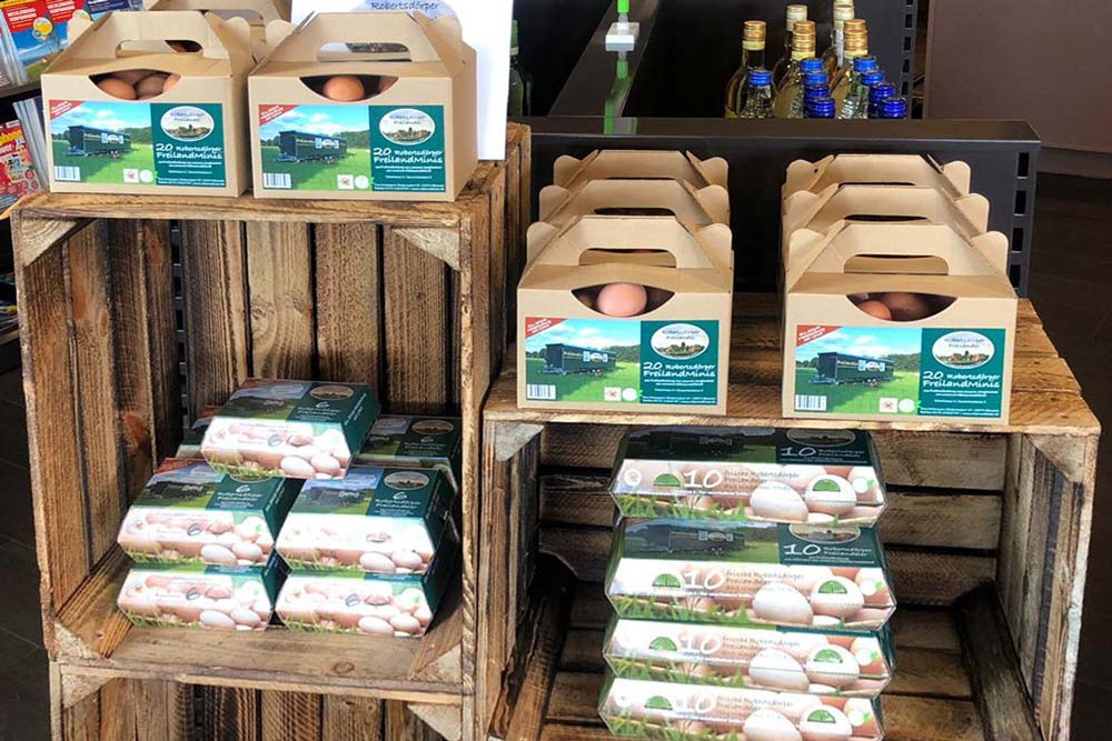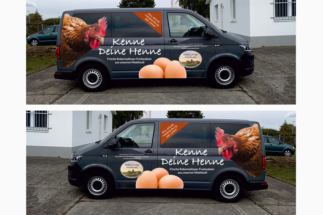 durch die Erstellung von Bannern für die Ställe, Aufklebern für Eierschachteln,